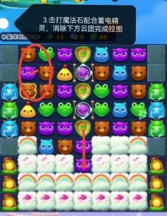 3、三消击打魔法石,借助水母宝宝与底部阳光瓶助力消除云团,云团剩余两行及以下时可以再次拉图