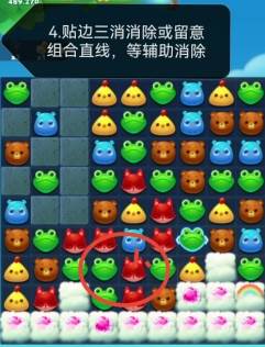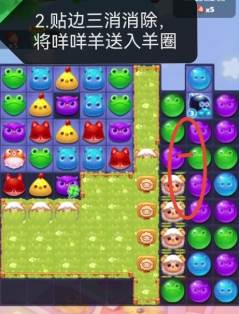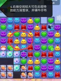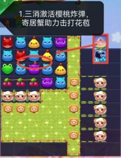 1、三消激活樱桃炸弹赶走咩羊,蓝色动物可以激活寄居蟹消灭冰柱动物掉下,同时花苞撒气鼓鱼在左侧空地初步铺牛仔。