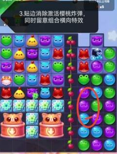 3、标注并消除两边的樱桃炸弹,尽量消除相同的部分,尽可能激活樱桃炸弹。