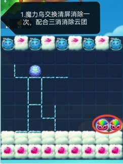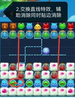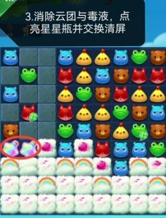 2、交换下面的直线特效,帮助消灭最上面的萌萌豆雪碧让动物掉下来,粘边消灭云朵拉下来。激活花团可以帮助消除云层。