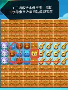 1、三消激活水母宝宝,在水母宝宝的帮助下,右消收集键解锁宝箱区域。