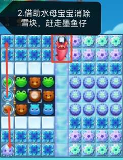 2、继续三消打击在水母宝宝的帮助下消灭雪块,配合边贴三消消灭雪块,赶走乌贼幼体。