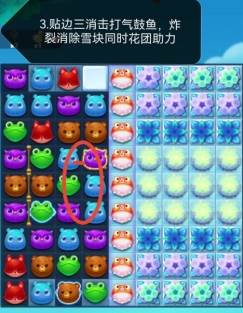 3、贴边和三消打在鼓鱼身上,鼓鱼爆裂帮助消除雪块,同时激活花球也可以帮助消除。