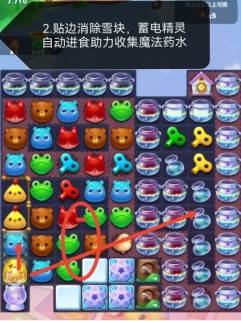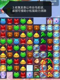 3、三消搜集发条并突破魔法罐,有贴边消弭雪块时机时优先消,底部雪块可借助小松鼠停止消让布谷鸟畅行