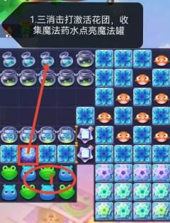 2、左侧可贴边三消消雪块,蓄电精灵借助传送阵自行进食助力,搜集魔法药水点亮魔法罐。