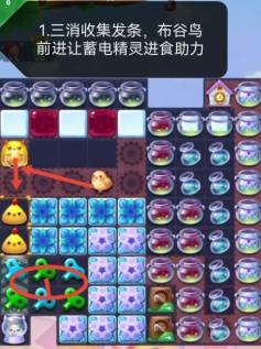 1、三消收集发条,布谷鸟行进将蓄电精灵挤下来进食,助力消上方雪块与毒液.