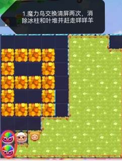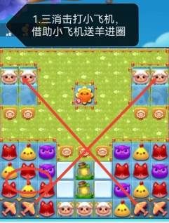 1、三消排除撞上小飞机,在小飞机的帮助下把咩咩羊送进羊圈。
