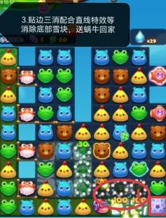 3、贴边三消,直线爆炸等特效用于消除底部的雪块,送蜗牛前进回家。