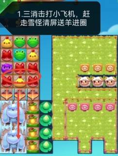 1、三消击小飞机,借助小飞机赶走雪怪一次清屏,送咩羊进羊圈。
