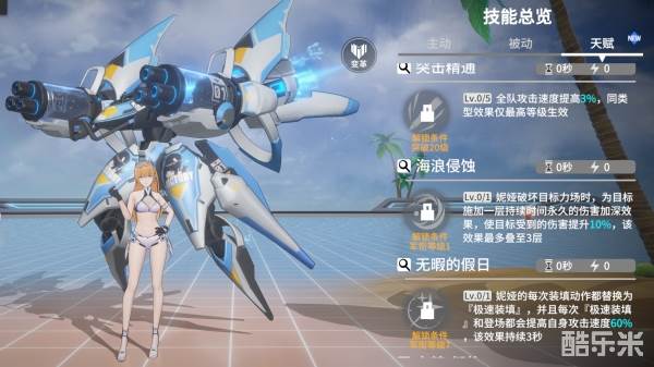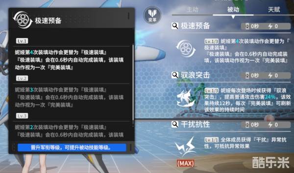 被动2【驭浪射击】:登场时获得普攻提升buff,三级有72%的普攻提升,效果比较可观。且完美装填能够刷新效果,一般情况下可以保持BUFF不间断,高效提升战斗力。