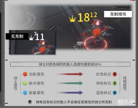 说到属性关系,就不得不说到游戏中骑士的属性,分为红色的动能属性,绿色的脉冲属性和蓝色的能量属性。