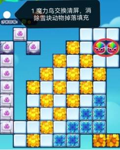 1:魔力鸟交换清屏消除一次,消除雪块动物掉落填充