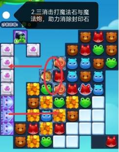 2:三消消除击打魔法石与魔法炮,借助魔法炮轰击左侧封印石,并激活冲刺鱿鱼