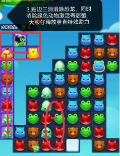 3:贴边三消消除小恐龙,同时消除绿色动物可激活寄居蟹,大眼仔释放竖直特效助力消除小恐龙