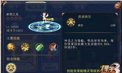 粉色及以上品质的精灵才拥有4种被动技能,与战斗有关的被动技能是第3种和第4种,每种精灵的这两项技能都非常有特色,在战斗中可以发挥巨大作用,那么由5个精灵组成的战阵就可以同时拥有10种被动技能哦,但是细心的玩家一定发现了,有些精灵的最后2种技能是有重复的呀,会不会技能叠加呢?咳咳,答案是:不会!不会!不会!!!重要的事情要说三遍,精灵技能不叠加,选择的精灵的时候需要注意他们的技能不重复,特别是最后2项技能,这样才能发挥精灵战阵的最大威力!