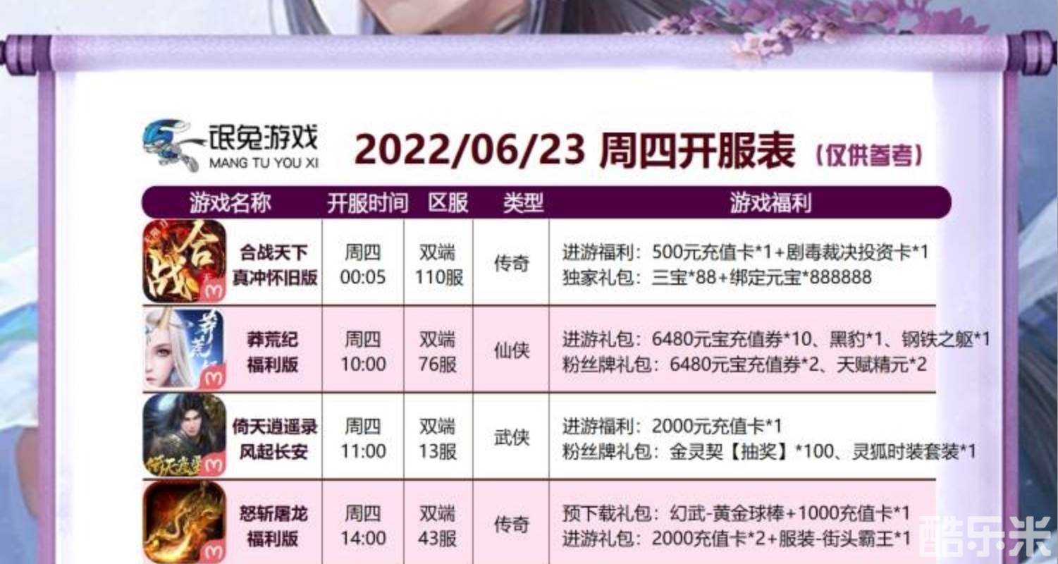 | 莽荒纪-福利版 | 双端76区( 苹果- 安卓) | 2022-06-23 10:00:00 |