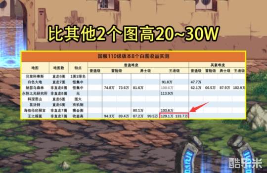 那么问题来了,目前110版本搬砖哪个副本更好呢?根据8张白图的实测,目前普通难度王者级最高收益为王之摇篮副本,收益在129.1W~133.7W之间,比乌森林和白色大地还要高20~30W。