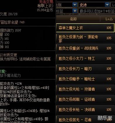 在《DNF》110级版本中,森林之魔女上衣史诗级别,可以材质变更,转换为板甲时,适用辅助职业专属属性。