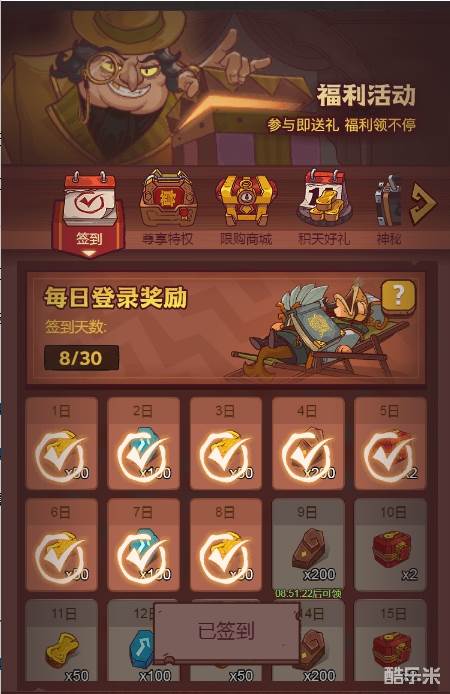 在这里每天签到可以获得一定的金砖,这里小咸建议经常玩的小伙伴开通一个月卡,还是很划算的,一个月也能领几千金砖。