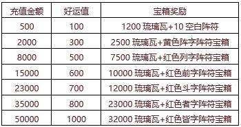 【活动内容】活动期间可通过充值金币获得好运值,积累好运值即可打开宝箱奖励,超多的琉璃瓦,大量的阵符宝箱,绝对超值的提升战力资源,尽在特惠好礼。