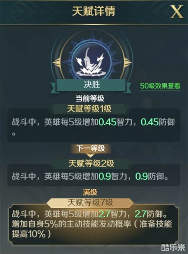 孙武的【决胜】天赋在三号位,较好培养。天赋技能可以提高自身准备技能发动概率,变相提高自身输出和治疗量。