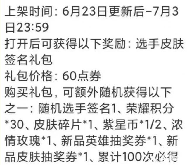 如下图所示,网友爆料称23号个性签名就会上线,然后通过礼包的方式抽奖,一个礼包60点券,100次必得全部个性签名,算下来差不多平均一百块钱一个了。然而实际上下面这样图中的内容并不是官方发的,而是玩家自己杜撰的,官方并没有说个性签名如何获得。