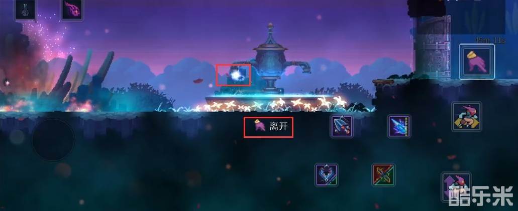 4、然后往右走,走到喷泉的左侧水龙头这里,点击离开按钮就可以钻进去。