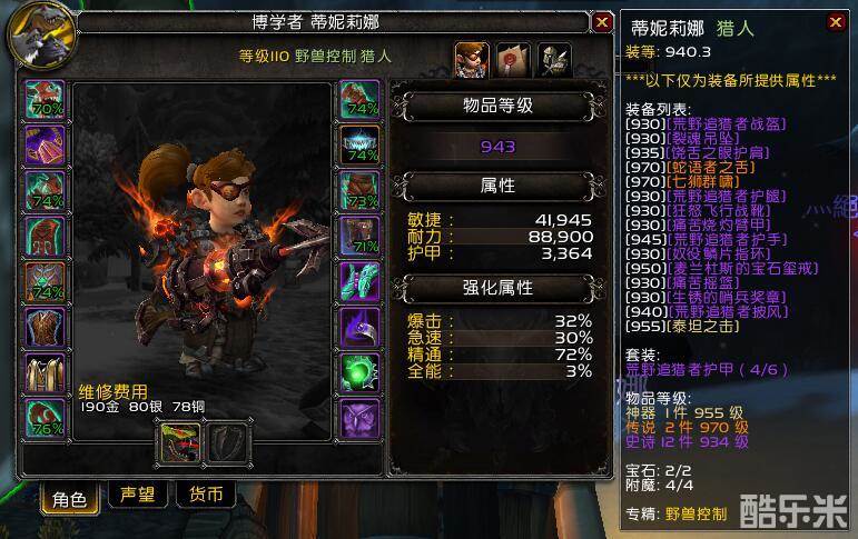 凶猛狂暴流属性主要为急速精通,急速的目的主要是压缩GCD,能在狂野怒火期间能够打出更多的眼镜蛇射击和杀戮命令,同时急速还能减少凶猛狂暴的CD,从而提高加速效果的覆盖,暴击属性并不是很重要的属性,因为几乎已经放弃了荒野呼唤的触发,目前楼主的配装属性如图: