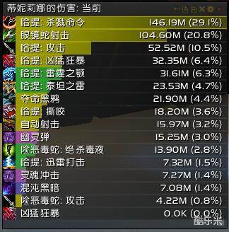 通过分析,大概发现凶猛狂暴流的红人覆盖相对于践踏流来说较低,仅为40%左右,但是凶猛狂暴的加速效果几乎可以做到全程覆盖(1-3层之间),凶猛狂暴的主要作用不仅仅是它的单体五连击伤害,更重要的是技能效果带来的宠物攻速提高,宠物普通攻击占比提高,在AOE战斗中,野兽顺劈斩的施放速度提高从而提升了AOE能力。