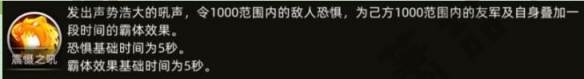 特色技能是震慑之吼,令周围敌人恐惧,友方获得霸体效果。