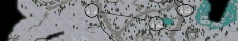 之后直接穿过红石岩到达大雪山,可以在红石城卖下东西,沿着道路往上到达点11高级兵营,打完沿着道路往下走到路口往右拐到点12两个玉石,在往点13走一箱玉石。