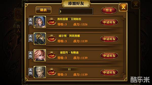 添加好友:在好友界面点击"添加好友",在弹窗的"添加好友"界面中输入玩家角色完整昵称可精确匹配,输入昵称中的部分文字或角色等级可模糊匹配。之后出现的列表中点击"申请好友"即可发出好友邀请,对方同意后即确立好友关系。