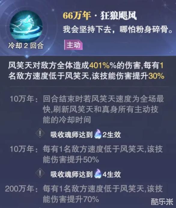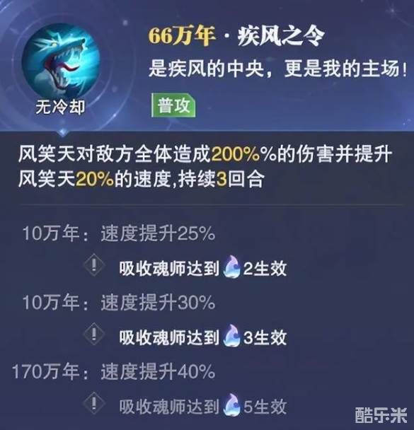 然后是风笑天真身技能,其效果是对敌方全体造成一定伤害,且根据对方速度的差距会有额外的增伤,最高可以达到420%的增伤幅度,效果还是比较不错的,另外此技能还有一个重要的价值便是当风笑天为全场速度最快,风笑天和真身的所有主动技能都将刷新cd,这也意味着风笑天和真身是可以一直不断的使用技能的,这也能让其在长图打伤害副本中的强度得到质变般的提升。