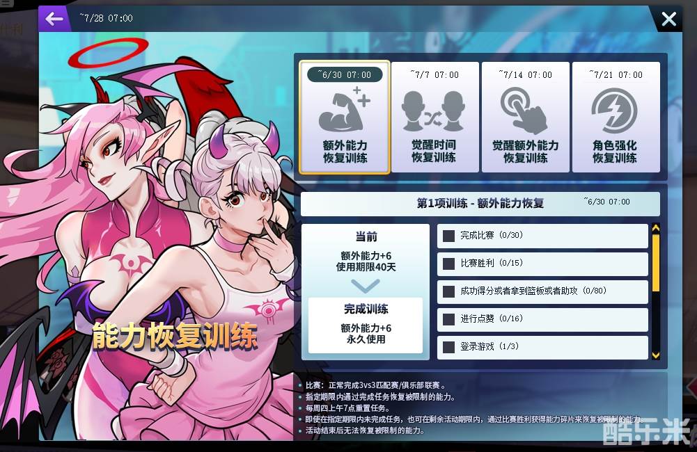 由于角色刚来到平行世界,还非常虚弱~需要通过“能力恢复训练”来恢复自身实力。一起来完成能力恢复训练任务后解除能力限制获得“完全体”的角色吧。每周通过完成任务来恢复能力。同时也不要错过与此活动一起进行的其他活动哦!