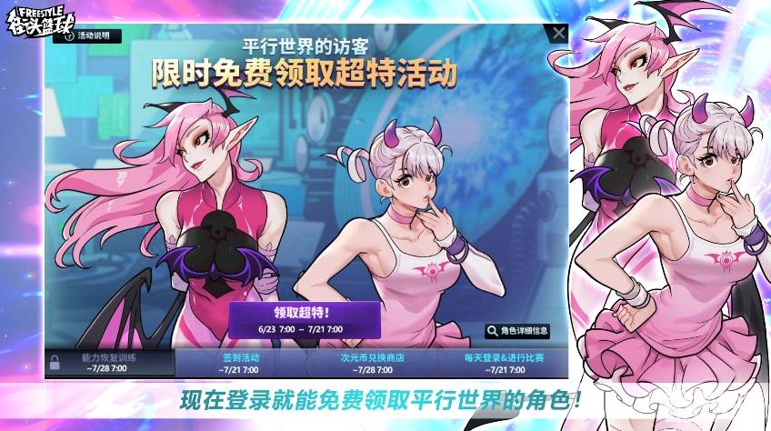 6月23日服务器维护后~7月21日上午7点,平行世界角色再度来袭,活动期间可以免费创建一个4种能力被限制的超特角色。