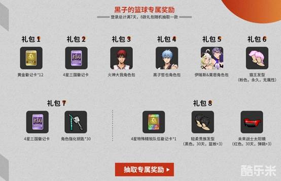 累计登库洛洛录满7日的回归账号,可在活动最终日获得抽取黑子的篮球专属礼包的机会,奖励随机,礼包共分为8种,奖励包括超特角色包、黑子火神角色包以及徽记卡等奖励。