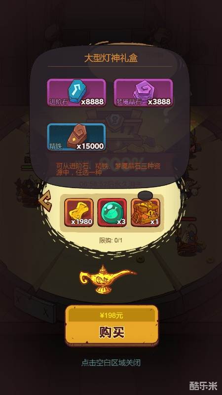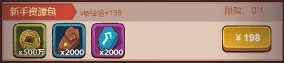 限购商城,新手资源包,198RMB有2000进阶石,2000精铁和500万金币。