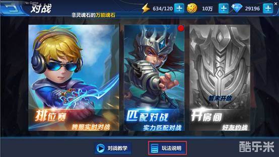 对战分为排位赛、匹配对战以及开房间。点击对战页面下方玩法说明可以查看三种对战的玩法介绍,点击对战教学可以查看对战教学视频,只是开始教学之后不能中途退出哟。