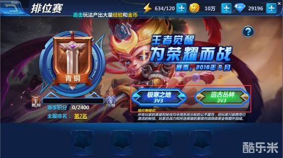 排位赛:分为极寒之地(3V3)单路对战以及远古丛林(3V3)三路对战场景,在全服范围内匹配真实玩家进行对战,胜利即可获得排位积分,失败的话会扣除一定数量的排位积分,达到排位升级积分之后即可提升排位赛段位。