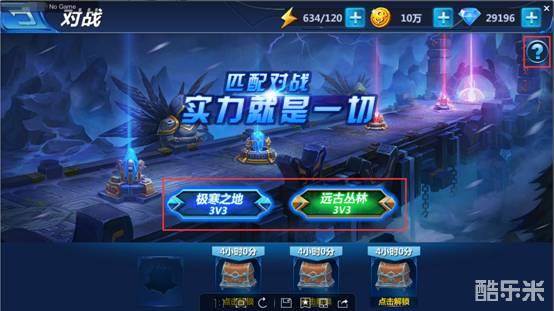 匹配对战:分为极寒之地(3V3)单路对战以及远古丛林(3V3)三路对战场景,在全服范围内匹配和自己战力相当的玩家进行对战。点击右上角问号能查看匹配战的具体规则哟~