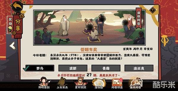 1.今天的问题是:东汉永元九年(97年),汉使甘英奉命率使团前往西方,出使大秦国,可惜受到阻拦,最终止步于安息。这里的大秦国指的就是?