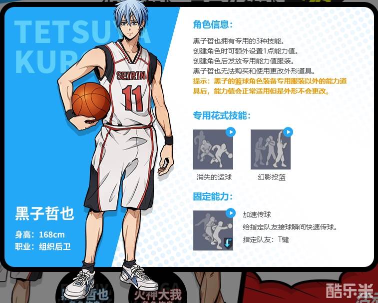 黑子哲也拥有专用的3种技能。创建角色时可额外设置1点能力值。创建角色后发放专用能力值服装。黑子哲也无法购买和使用更改外形道具。提示:黑子的篮球角色装备专用服装以外的能力道具后,能力值会正常适用但是外形不会更改。