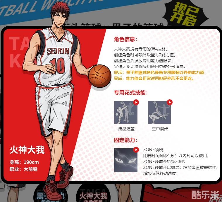 火神大我拥有专用的3种技能。创建角色时可额外设置1点能力值。创建角色后发放专用能力值服装。火神大我无法购买和使用更改外形道具。提示:黑子的篮球角色装备专用服装以外的能力道具后,能力值会正常适用但是外形不会更改。