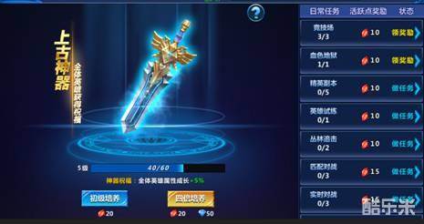 2、玩家可以使用活跃点对上古神器进行升级,也可以花费钻石加活跃点开启4倍培养。