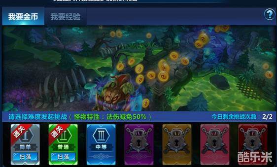 丛林追击分为金币以及经验两个不同类型的副本,拥有不同级别难度,每个副本每日可以挑战两次。每个副本的BOSS属性都不相同,可以根据BOSS的属性更换不同的英雄出战,击败BOSS。