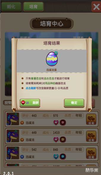培育,就是处理多余恐龙的一个方法,同时是获得新龙蛋的一个场所,恐龙生蛋必须消耗雌雄2只同类型的恐龙,选择好需要培养的恐龙后,点击“开始培养”即可生成龙蛋,注意:生成龙蛋以后原来的恐龙会消失!新生的龙蛋数量为1-3个之间随机,生出的龙蛋有概率是变异龙蛋哦!