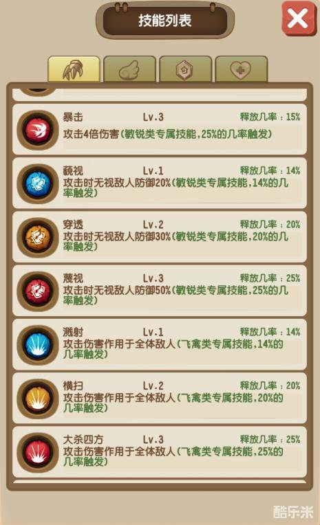 恐龙拥有的技能种类较多,分元素、攻击、回血、加成几种,具体效果游戏内的技能列表都做出详细介绍了哦!