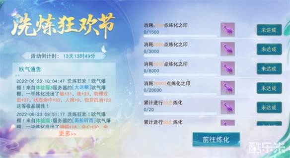洗炼狂欢庆,大荒乐翻天。6月23日-7月6日期间,大荒洗炼狂欢节正式开启!少侠只需累积消耗指定的炼化之印或完成指定次数的炼化操作,即可获得丰厚的炼化之印奖励。同时活动期间,将在活动界面开启欧气通告,若是洗出了欧气词条,本区服务器的大荒少侠们,都可以在通告上看见少侠你的身影哦。