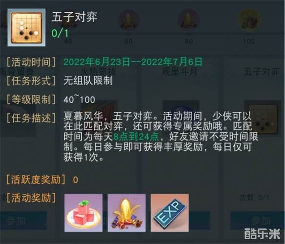 夏暮风华,五子对弈。6月23日-7月6日期间,少侠可通过进入游戏内的【活动】页面进行匹配对弈,获得专属奖励。匹配时间为每天8点到24点,好友邀请将不受时间限制。少侠只需每日参与即可获得丰厚奖励。