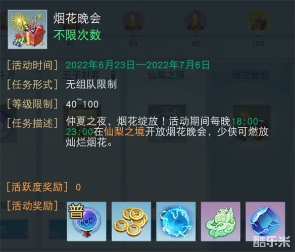 仲夏之夜,烟花绽放!6月23日-7月6日期间,仙梨之境将会在每晚18:00-23:00开放烟花晚会,在此期间,少侠可通过燃放灿烂烟花获取丰厚活动奖励。